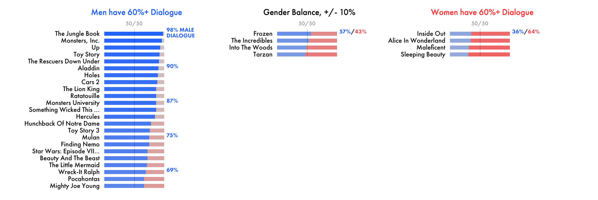 Polygraph recently released an analysis breaking down the dialogue spoken in 2000 screenplays by gender. If we look at the sample of 30 Disney films analysed, we find that 22 of them have a males accounting for majority of the dialogue. 22 out of 30! This is hideously unequal! Movies like the The Jungle Book and Monsters, Inc. have almost all dialogue spoken by male characters (98% in The Jungle Book), while the extremely short list of four movies with a majority of dialogue spoken by females only had them contributing a little over 60% of the dialogue (Alice in Wonderland, Inside Out, Maleficent, Sleeping Beauty).