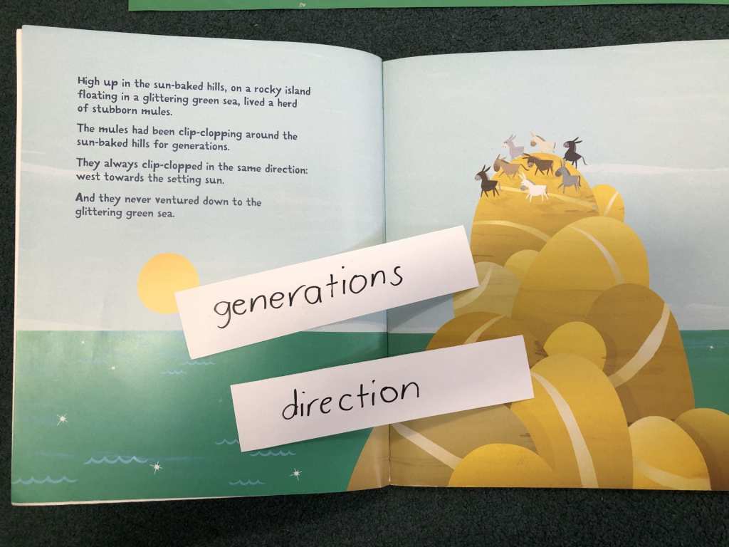 Today we listened for the /shn/ sound (because a lot of my students have been interested in stop motion lately and I have seen every variation of attempted spelling possible for stop moshune/stop mishin/stop moton, to name a few). I read them a few pages of the book ‘Melu’ by Kyle Mewburn and they said “shn” whenever they heard the sound in a word. We found two instances and an almost-example, which helped to refine the task.