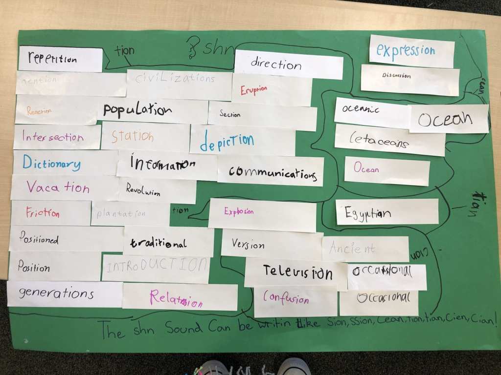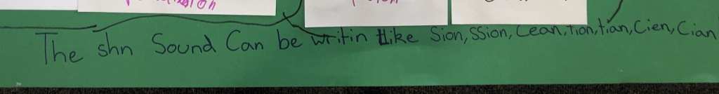 Today it was “The shn sound can be written like sion, ssion, cean, tion, tian.”