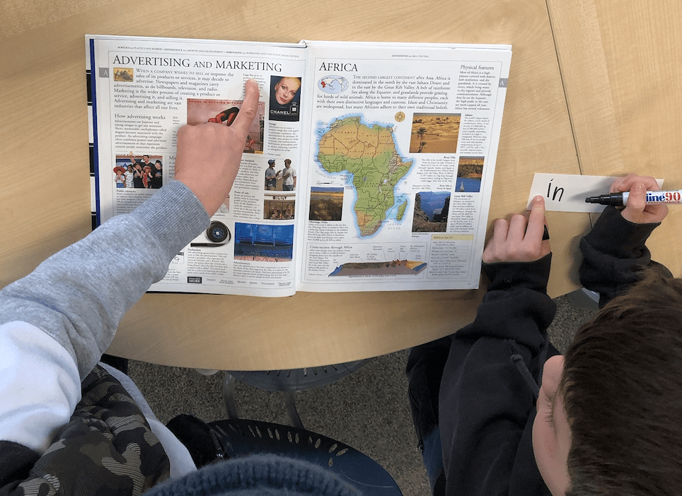 Students read aloud in pairs and notice when they hear the sound. Using pairs allows for one student to read while the other listens for the sound. They write down the word if no one else in the class has written this word down yet. They add it to the growing pile of words found with the featured sound.
