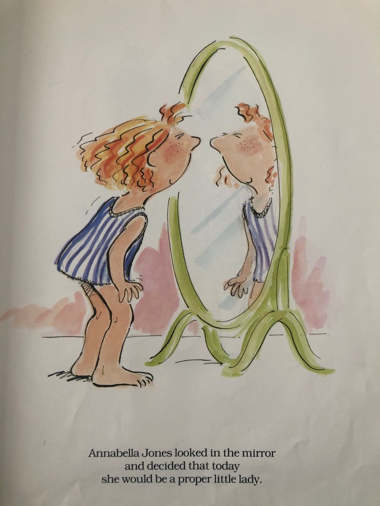 Creating a lead – ‘Annabella Jones looked in the mirror and decided that today she would be a proper little lady.’ The lead in this story tantalisingly invites the reader to turn the page so they can find out exactly what makes a ‘proper little lady’. The picture also hints as to what might be involved.