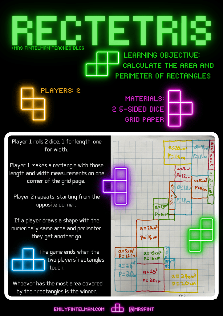 I whipped up this game earlier this year to give my students the opportunity to practice calculating area and perimeter of rectangles. I wanted a game that included a genuine use for finding out both area and perimeter and could’t find anything.