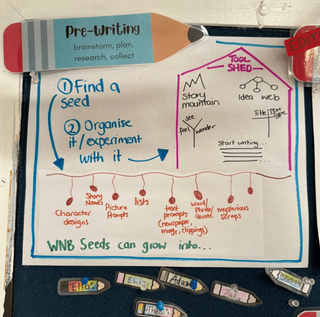 I introduce each phase gradually through the year, bringing them in as needed. We develop the language, tools and our own story around each phase through discussion, creativity and trial and error. I strongly believe that this has to be a discussion developed together, not a set of laminated charts to memorise and adhere to (see Emily’s class circa 2012). I find that in upper primary there are already many existing understandings about writing processes and that we can easily co-create a shared understanding, with some teacher guidance, prompting and explanation.