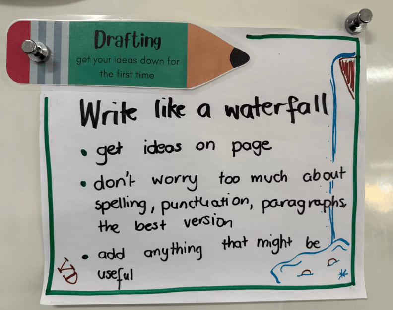 But, a small contingent of students rejected the waterfall, remembering a visiting author call it a ‘vomit draft’, where all your ideas just spew onto the page, and it probably won’t be pretty at this point. They wanted this shown on the anchor chart. A spirited discussion led us to using ‘brown, fancy, not gross, letters’ to write the initials for vomit draft so that the die-hard vomit analogy fans felt represented. Please don’t just write ‘vomit draft’ on your chart. I explain this to illustrate how we co-construct our definitions together, based on the needs and experiences of the group.